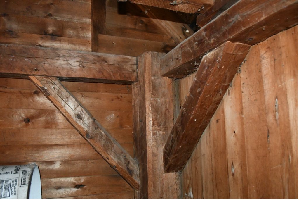 Aujourd’hui, il s’agit d’un bâtiment rectangulaire de 16,72 mètres par 6,87 mètres, coiffé d’un toit à deux versants. Ce bâtiment à deux étages, assez rare pour une grange à cette époque, repose sur un solage de pierres et, à l’origine, était recouvert de planches verticales et d’un toit en bardeaux de cèdre. Cette grange à dîme, une des rares subsistant au Québec[9], comporte à l’intérieur beaucoup d’éléments d’intérêt. On y retrouve des poutres massives équarries à la hache, des chevilles de bois, des planchers en madriers fixés à clous forgés et une charpente de bois de pièces sciées dont l’assemblage est fort intéressant. (Photos 7 et 8, intérieur de la grange)
